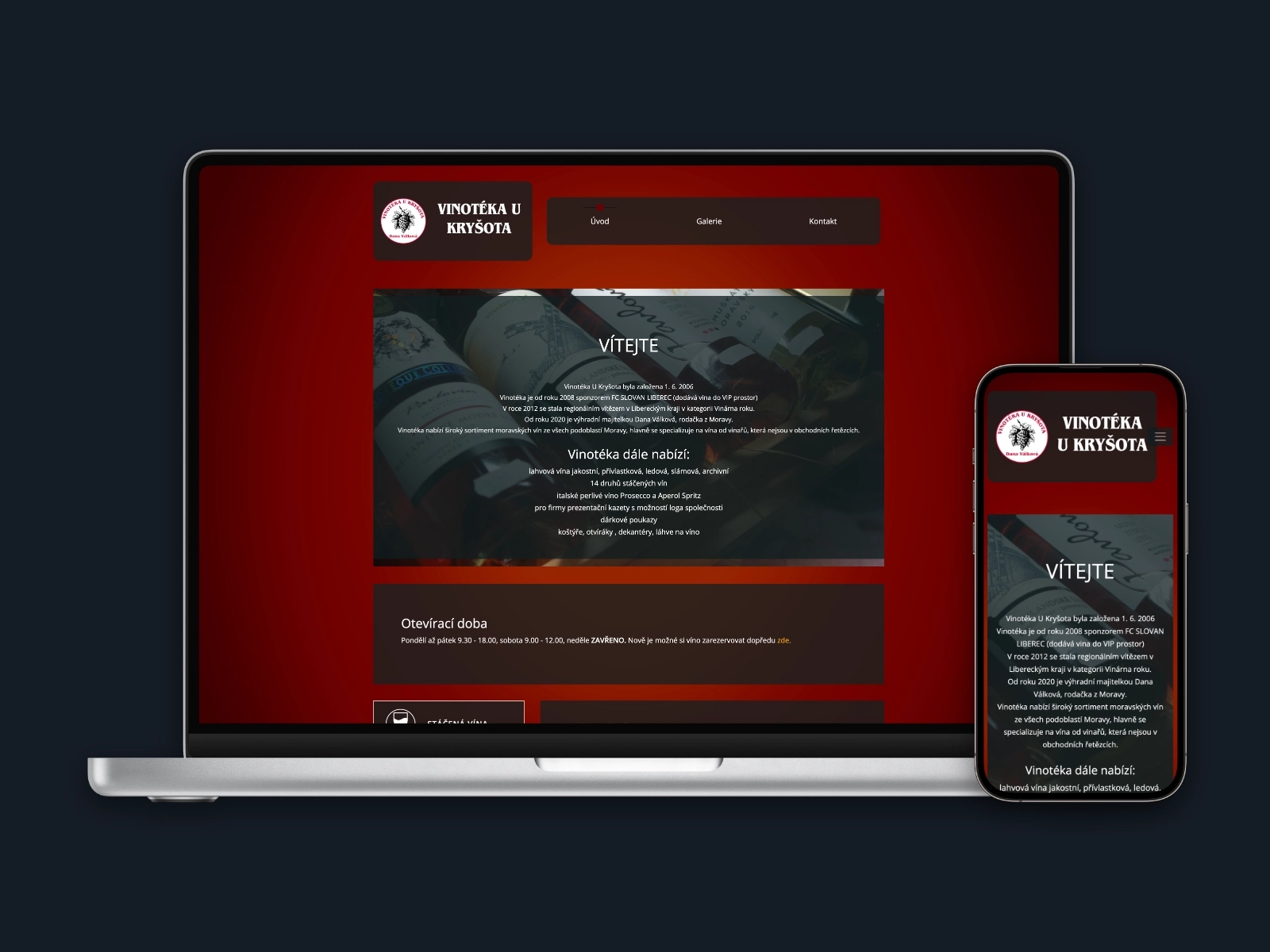 Web pro Vinotéku u Kryšota byl prakticky první komerční projekt, v té době jsem nastupoval do prváku, to byly časy... Jsou to jednoduché statické stránky s emailovím formulářem, který je napsaný v PHP. Při tvorbě stránek jsem použil Bootstrap, který jsem doplňoval svým CSS. Při tvorbě galerie jsem použil JS knihovnu Lightbox, protože se mi líbila její interaktivita. Logo stránek a veškeré fotky co jsou taky moje práce. Fotky se následně použil v článku denik.cz. Na samotný web se můžete podívat zde.